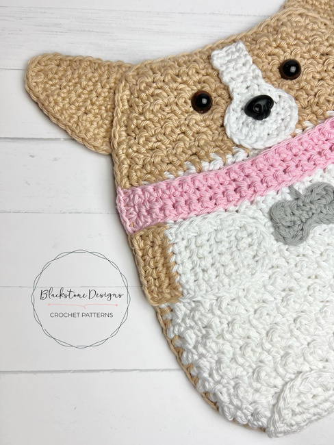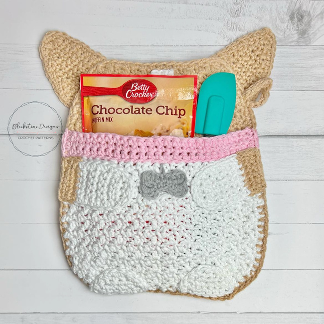 The crochet Corgi Pot Holder is the perfect gift for dog lovers! This crochet pot holder has a pocket on the front for adding little gifts like cookie mix, spatulas, and recipe cards.