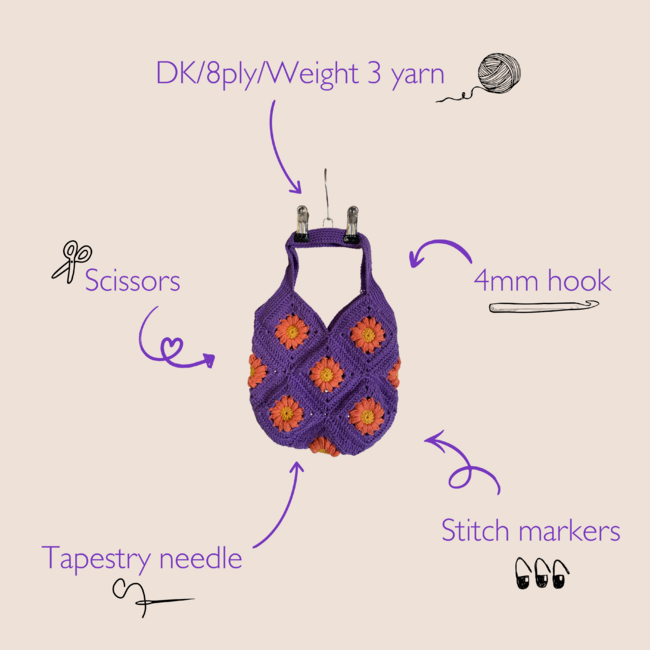 To make Cosmos Flower Handbag you will need: 150g, 100g, 25g. Tools required: 4mm, Tapestry needle, Scissors.