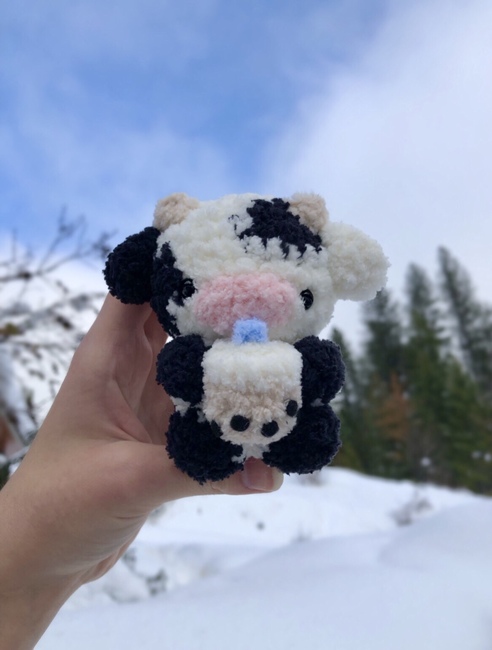 This is a bundle containing 3 patterns: A baby cow in overalls, a cuddle cow, and a cow sipping boba!