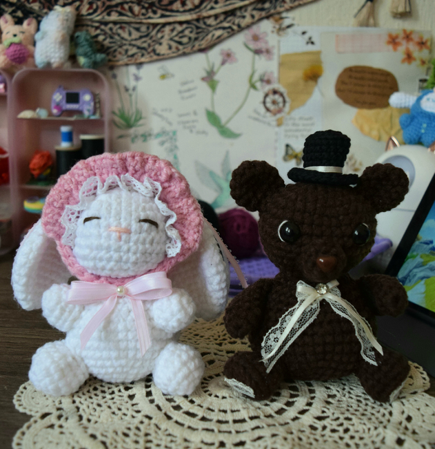 I love the era of bonnets and laced clothing and bows so I made these plushies to represent that:D