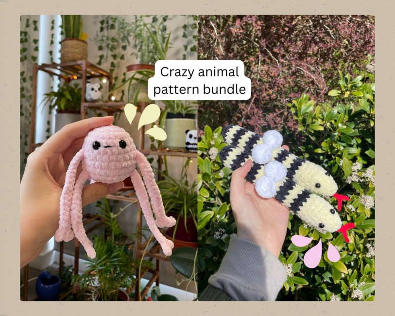 This bundle consists of my bestselling no-sew LankyBlob ® pattern and my low-sew bumble snake pattern!