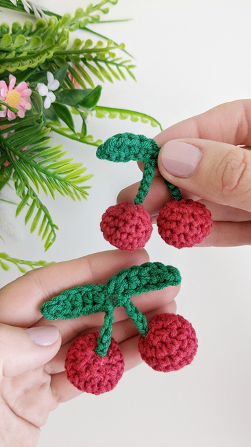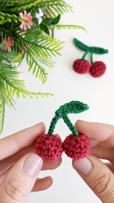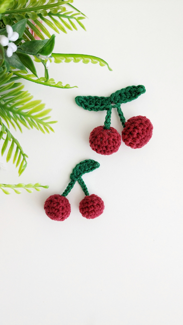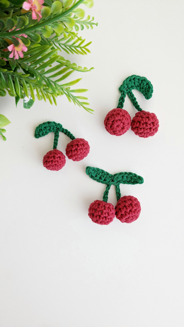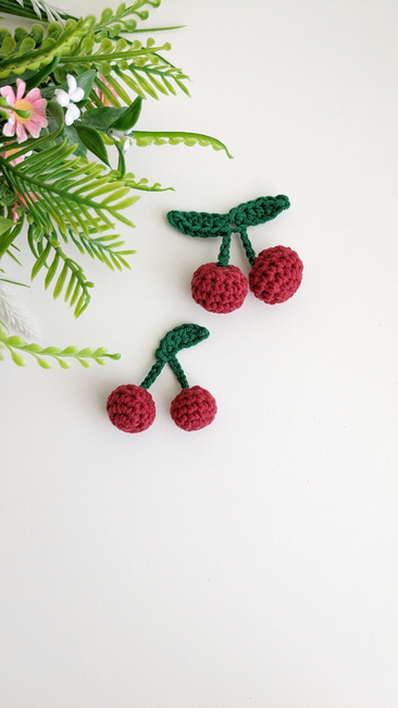 This crochet cherries pattern is a great project for crochet beginners. It's very easy and quick to make. You can use these cute cherries as a cute keychain, a toy for the play kitchen or as a decoration in the children's room.