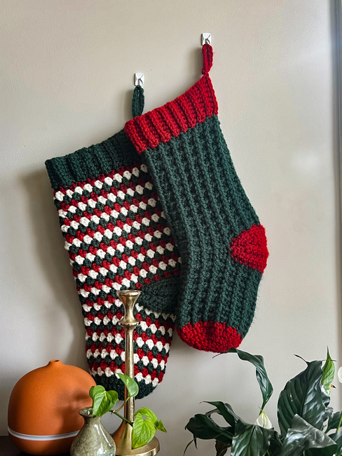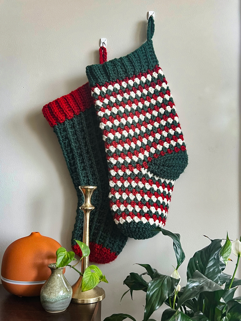This bundle includes the patterns for my waffle stitch and granny stitch crochet stockings.