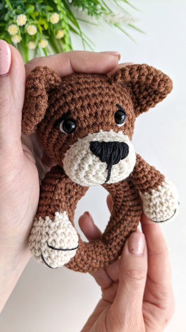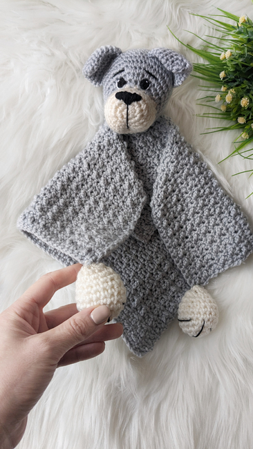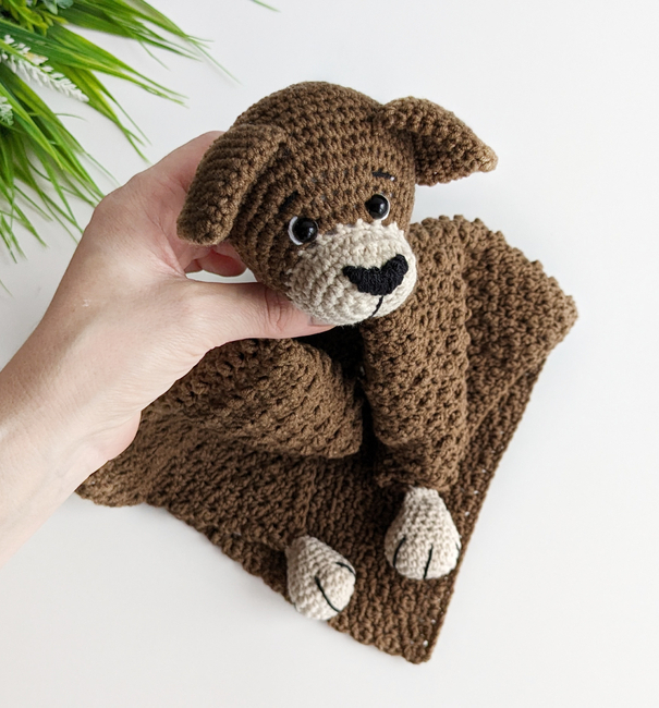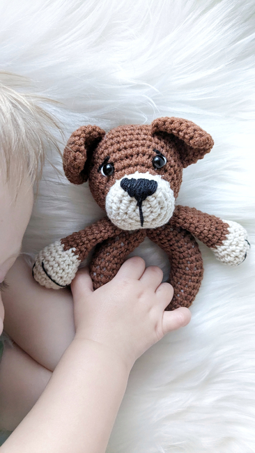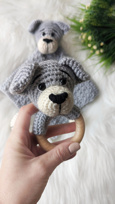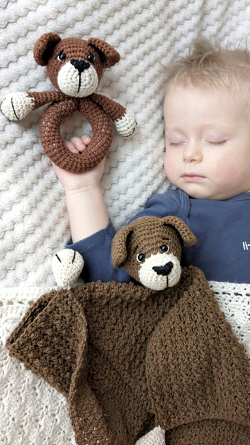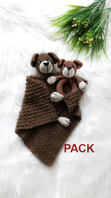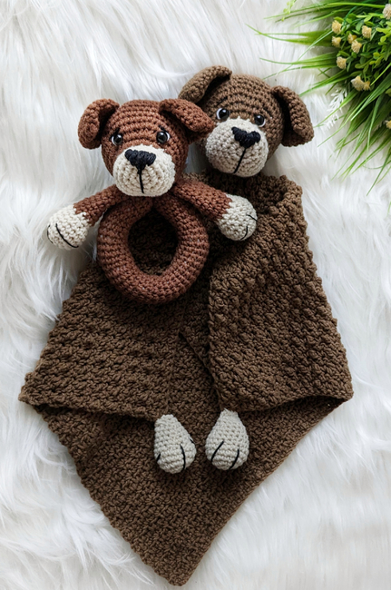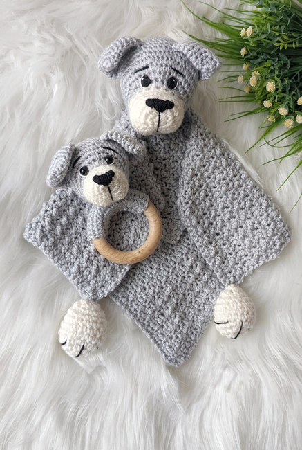 Crochet a dog baby lovey blanket and baby rattle with this pattern pack! This crochet toys make perfect newborn or baby shower gifts.