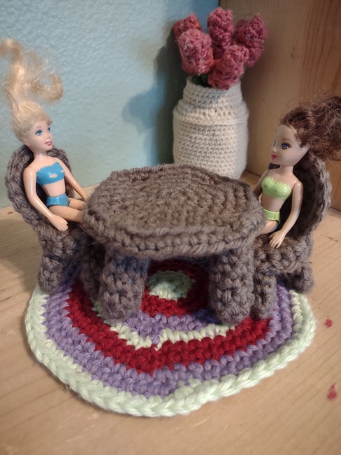 The table pattern is from here: https://www.topcrochetpatterns.com/crochet-patterns/dolls-house-furniture-crochet-along-part-1#login-box24