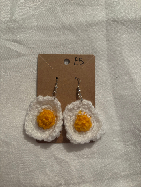 This pattern makes the perfect size fried egg to use as a charm for a keyring or as earrings . The yolk stands above the white of the egg to create a 3D look. I suggest blocking the fried egg before using it to make anything to avoid curling. When the pattern says 2sc it means to do 2 single crochets in 1 stitch whereas sc2 means to do 1 single crochet in each of 2 stitches.