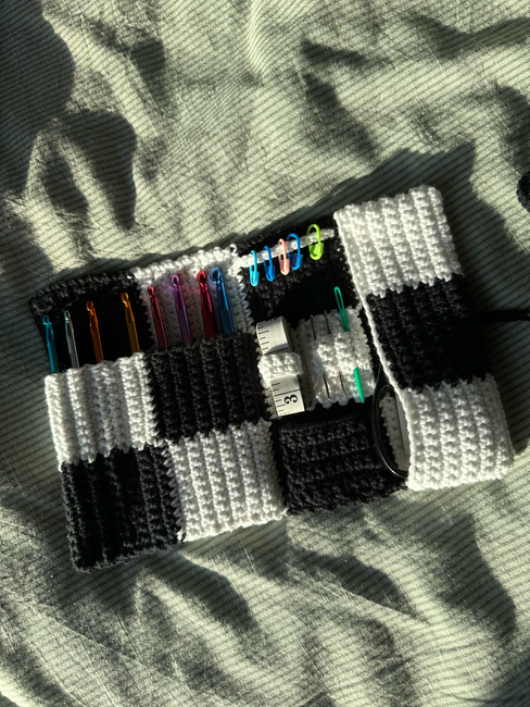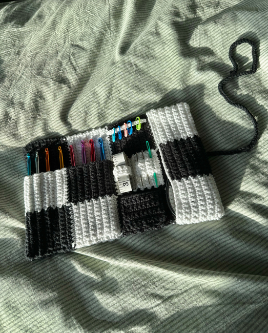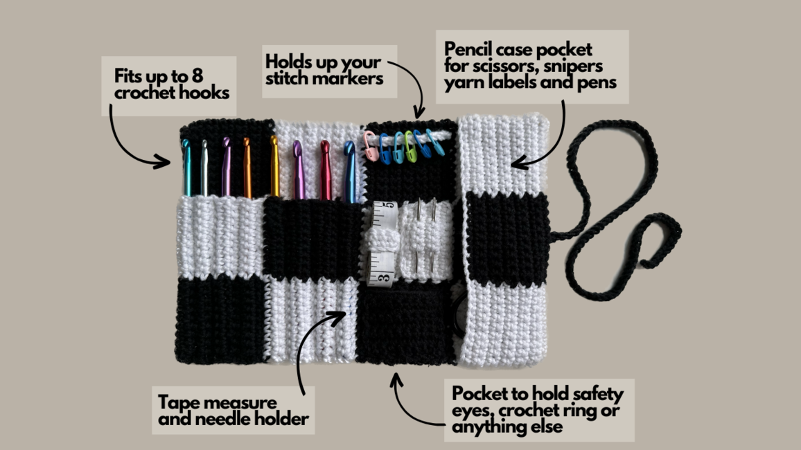 Crochet hook case pattern, that will fit all necessary tools and accesories used daily, including up to 8 crochet hooks, stitch markers, needles, measure tape, scissors, snippers, pens and yarn labels, safety eyes, crochet ring and more.
