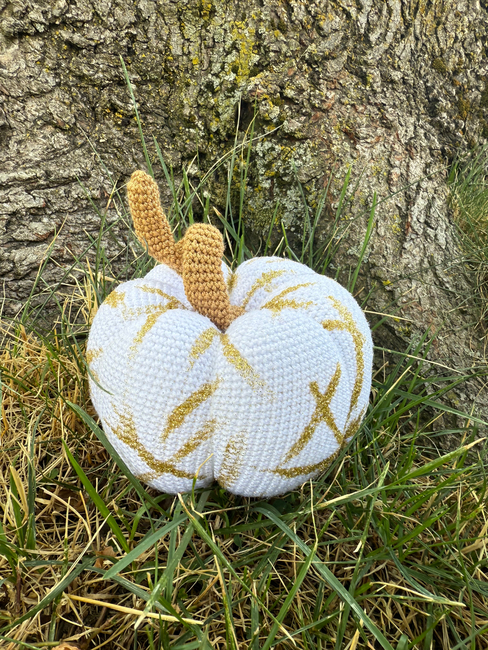 To make Crochet Pumpkin with glitter fall decor you will need: I used YARN:* Alize Diva Silky Effect ( color 369 Caramel )* Alize Diva Silky Effect ( color White )Also you can use any Fine or Light Worsted yarn, Long tapestry needle Stitch markers or a scrap of contrasting yarn Scissors Fiberfill for stuffing* Floral wire 18 in ( 45,7 cm ) 1 pc* Adhesive plaster ( tape )* High Temperature Glue Gun Hot glue sticks* Gold glitter* Glue PVA* Craft finishing spray* Paintbrush* Transparent Nylon thread. Tools required: hook 2 mm.