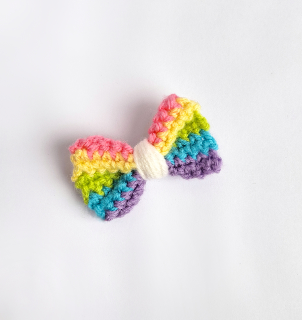 A cute rainbow accessory that can be used as a hairclip, bowtie or a cute pet accessory. This crochet bow is a beginner crochet pattern that uses a Ch and DC stitch only and is a great way to practice changing colours in crochet.