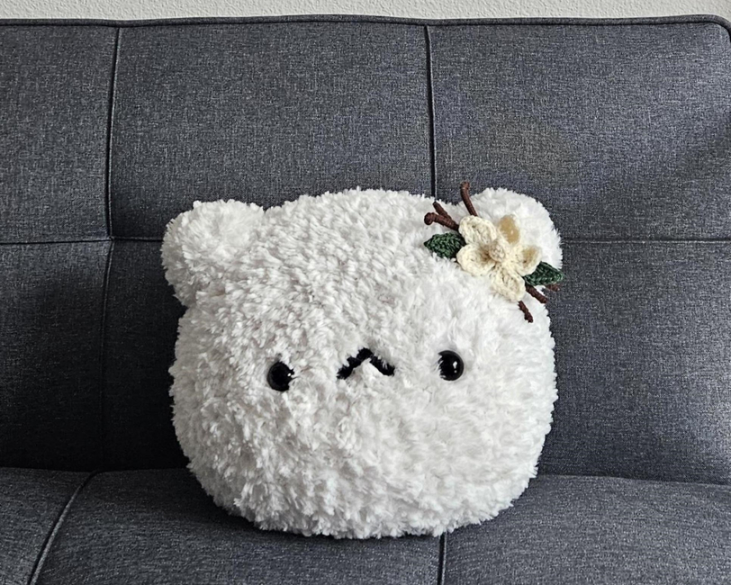 Hi~ This is a crochet pattern of a White bear with a Vanilla Bean flower accessory. this bear can be used as a mini pillow or a lap pillow.