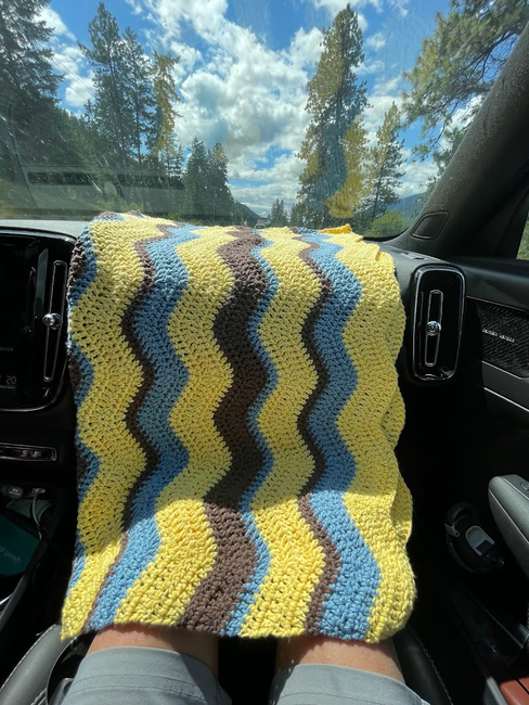 The blanket will have three colours and measure roughly 30x40 inches when completed.