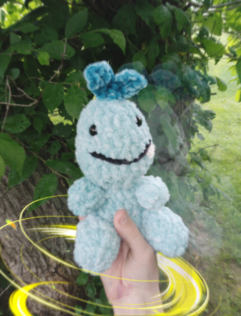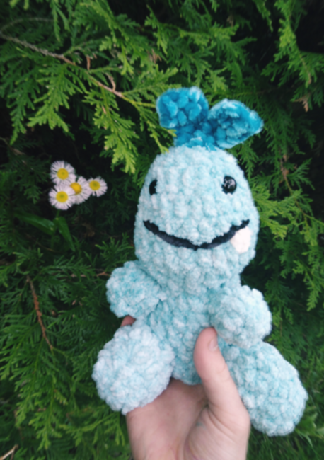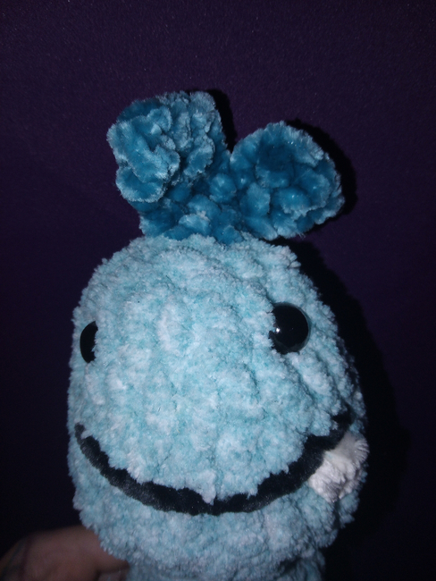 To make Crystal the Cryloposaurus you will need: Aqua, Blue yarn, 12mm eyes. Tools required: 5mm crochet hook.