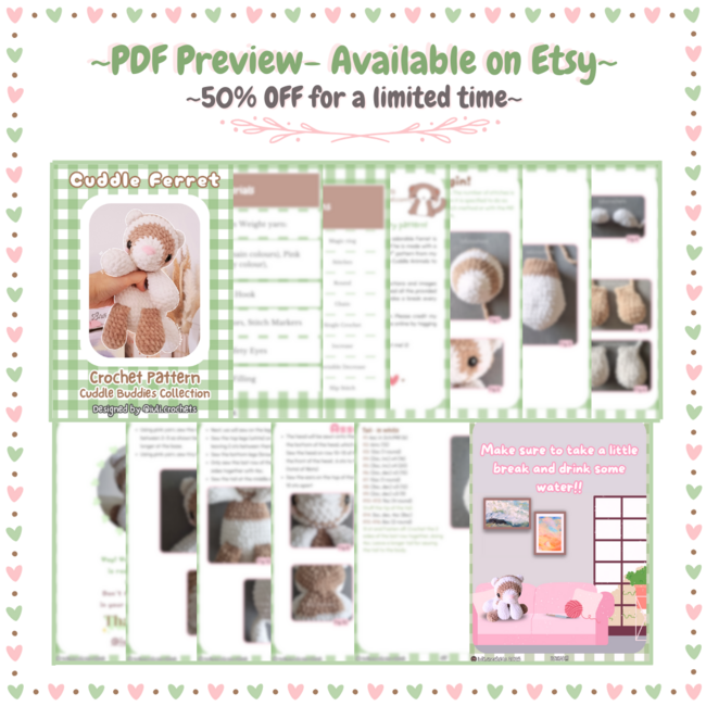 This pattern includes many detailed instructions and images on how to make the cuddle ferret. Please read all the provided instructions carefully and don't forget to take a break every now and then! <3