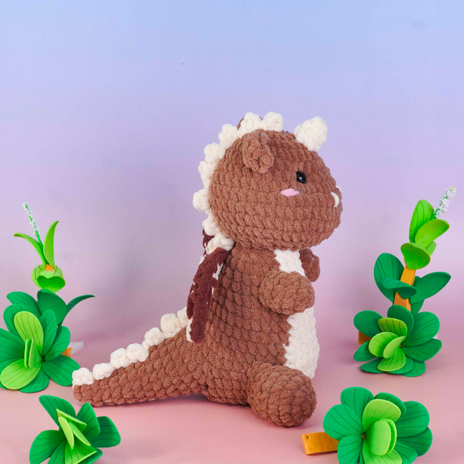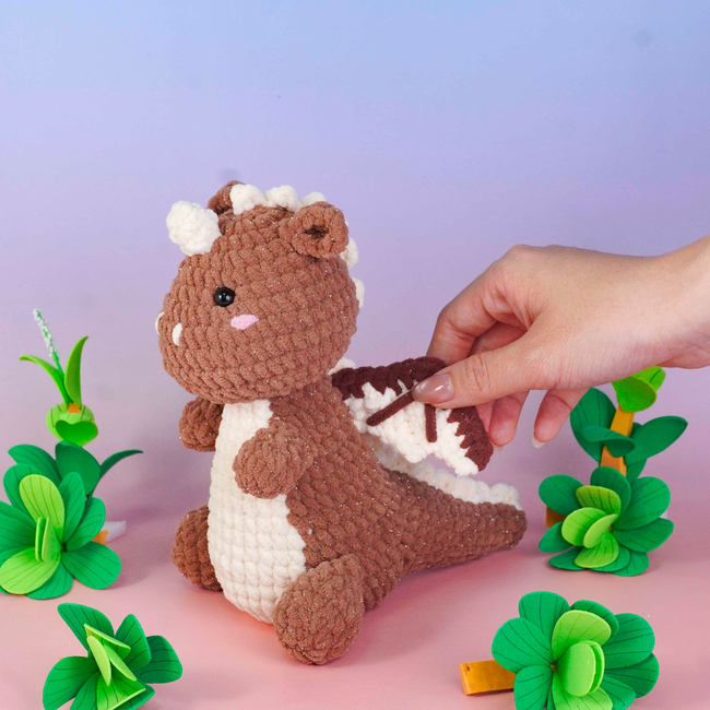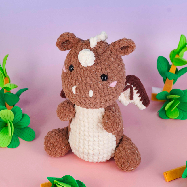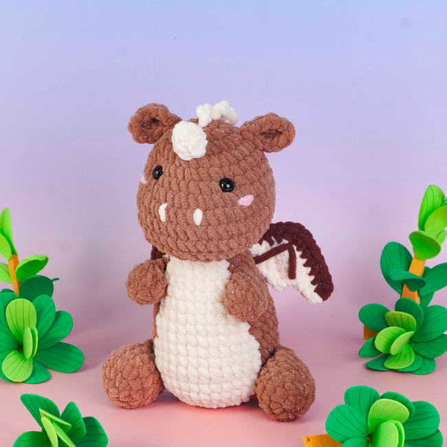 To make Cuddly Dragon Crochet Pattern you will need: Color: Brown, dark brown, and cream, Stitch markerSewing needleScissorsPlastic safety eyes (9mmx2)Fiberfill. Tools required: 4.0mm.
