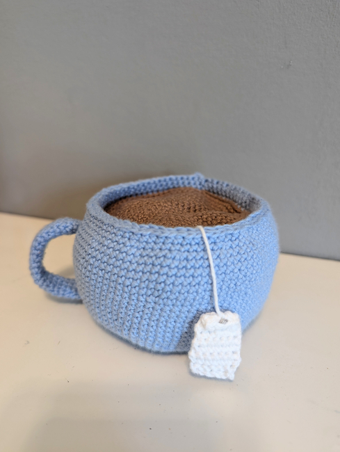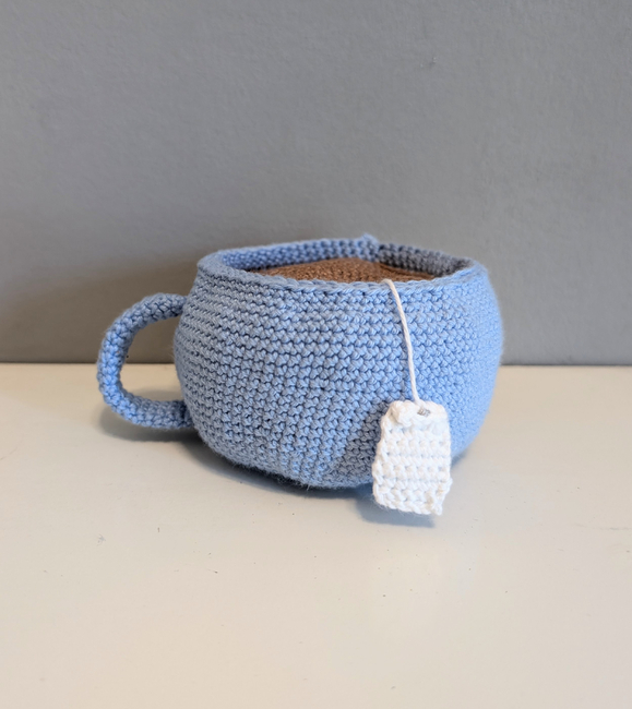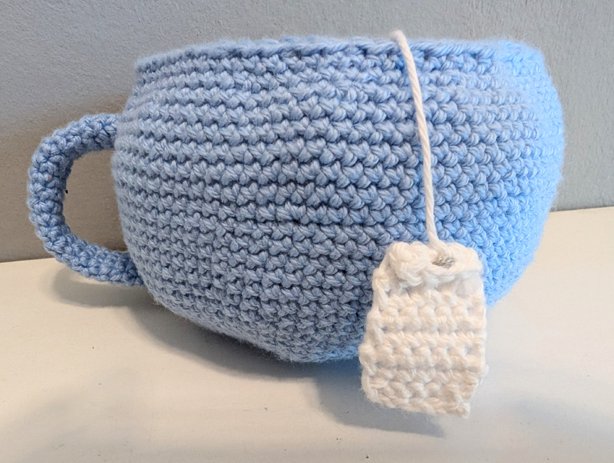 This crochet teacup pattern is perfect for adding a touch of whimsy to your home décor, as a gift, or for play tea sets. The design features a simple teacup with a teabag tag.