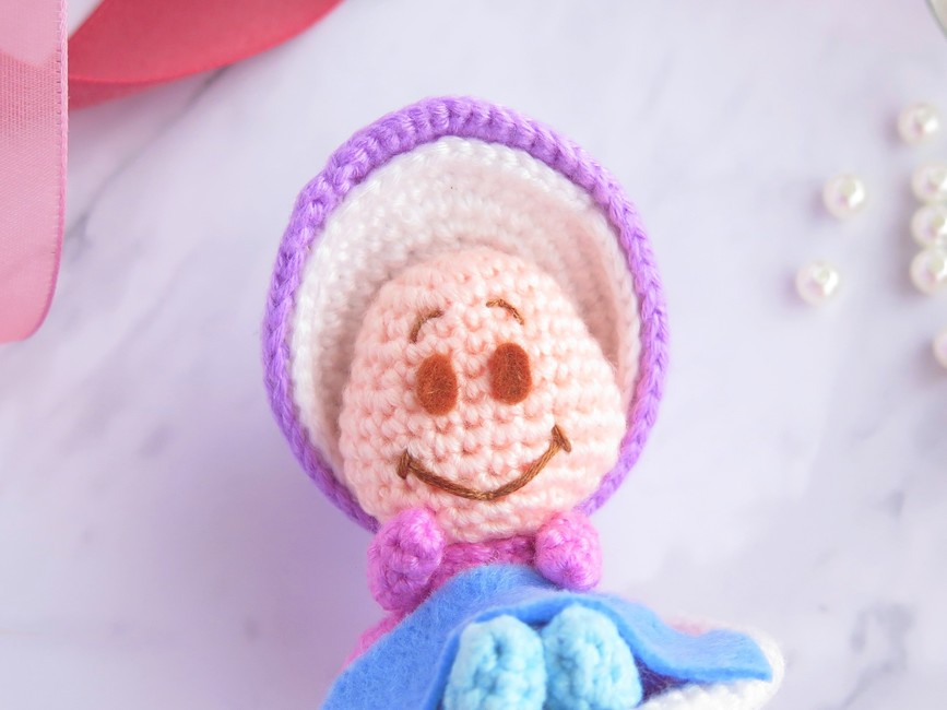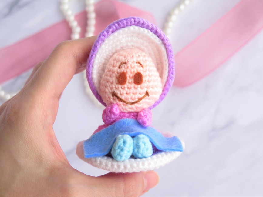 To make Curious Oyster (Alice in Wonderland) you will need: White, Purple, Magenta, Peach, Light blue, - Embroidery floss (White, brown)- Felt (Blue, brown)- Stuffing material- Fabric glue- Yarn and embroidery needle. Tools required: 2.5 mm (any size is fine, as long as you use the appropriate yarn).