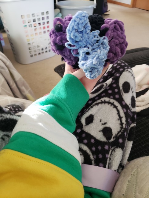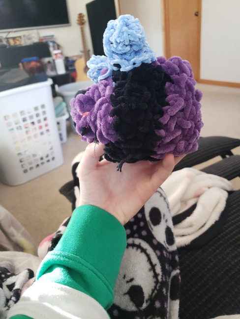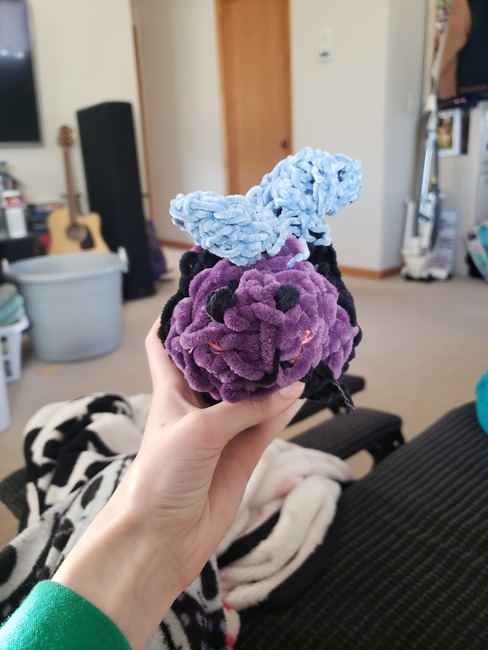 Black Any color (I used purple) Blue (for the wings) Embroidery thread for the mouth and/or eyes (optional) Embroidery thread for cheeks (Optional)