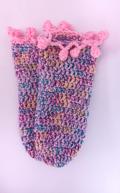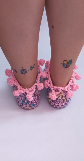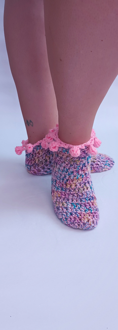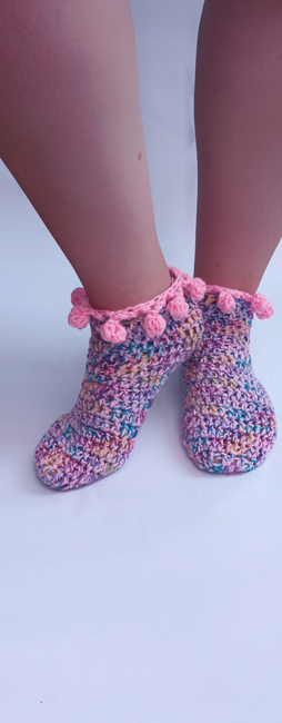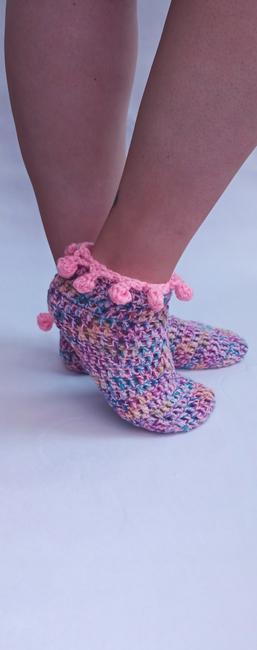 An ankle sock that is made with Aran yarn crocheted together with a 5mm Crochet hook making them cosy, chunky and quick to work up. What's more each design teaches a new edging type which can be used in other areas of crochet. This design includes a fun pom pom edging.