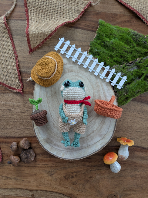 In this crochet amigurumi pattern, you'll find instructions to crochet this cute little frog, with moveable arms and legs, and its garden outfit : dungarees, a sun hat, a bandana, a basket and a little sprout.
