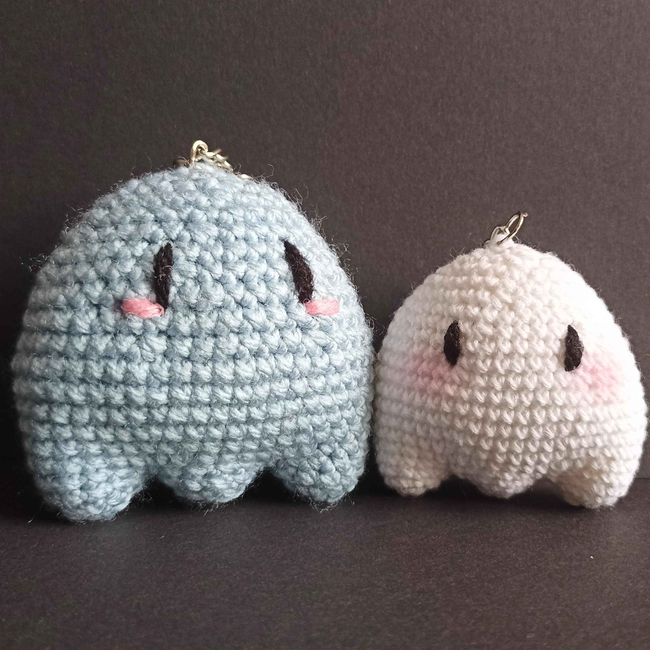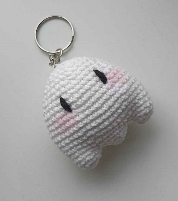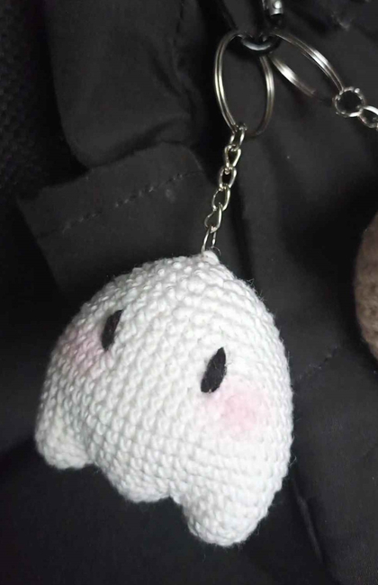 This is a pattern for making a cute and tiny ghost! Thanks to its small size, it's perfect for a keychain, but feel free to use thicker yarn to make it bigger.
