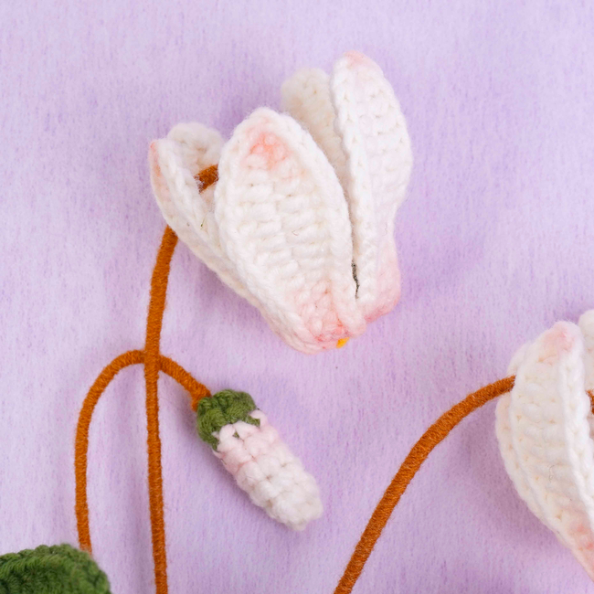 To make Cyclamen Flower Crochet Pattern you will need: Color: White, yellow, brown, light green, and green, Stitch marker Sewing needle Scissors Craft wire (0.5mm) Hot glue gun. Tools required: 2.5mm.