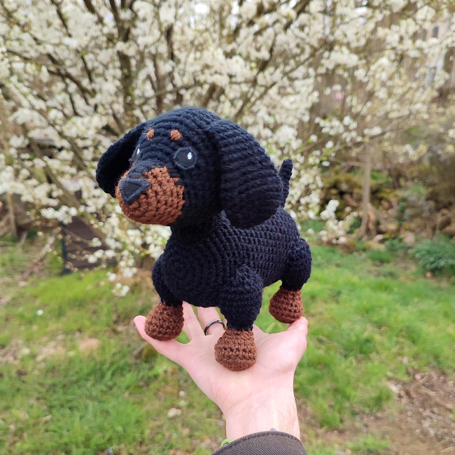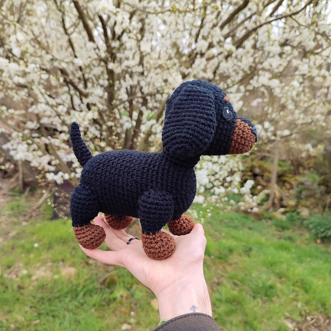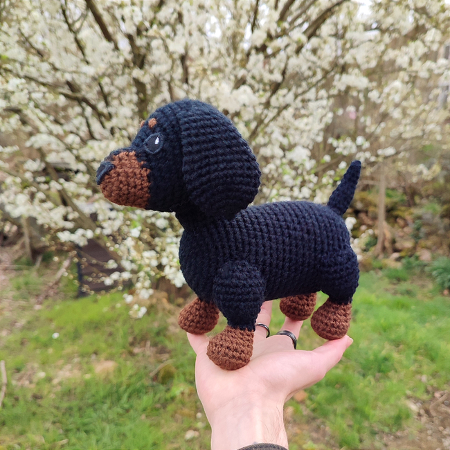 I did mine with size 4 yarn and a 3,25mm crochet hook, and the plush is 22cm long and 18cm tall, but you can make it in any size you want