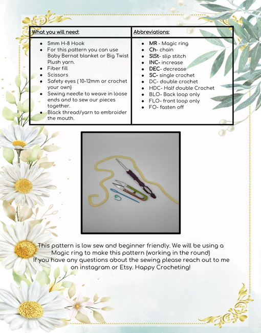 Bring a touch of sunshine to your crochet projects with Daisy the Flower! This adorable plush daisy will brighten up any room with its sweet smile and soft, plush petals. Whether you're creating a gift for a loved one or adding a bit of floral charm to your space, this pattern is sure to make your heart bloom!