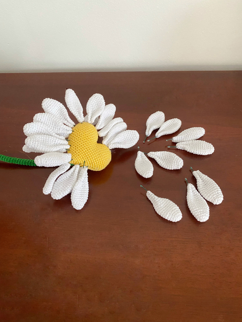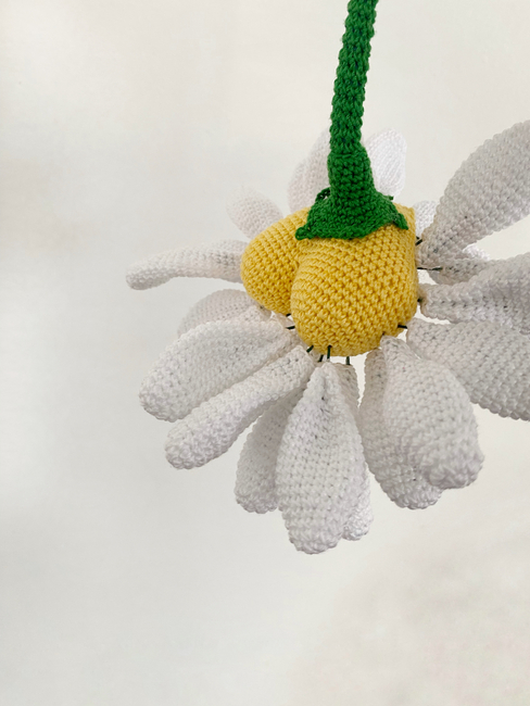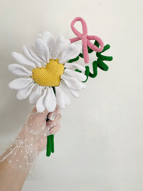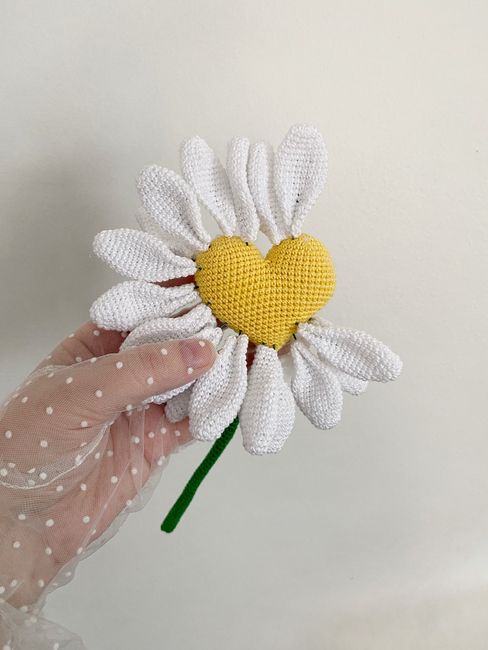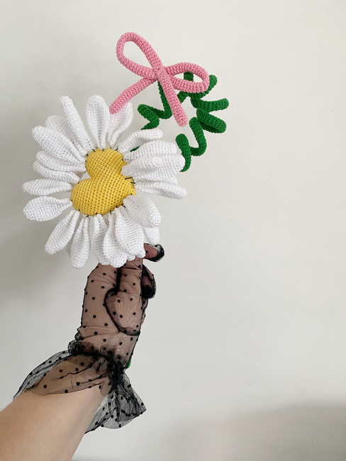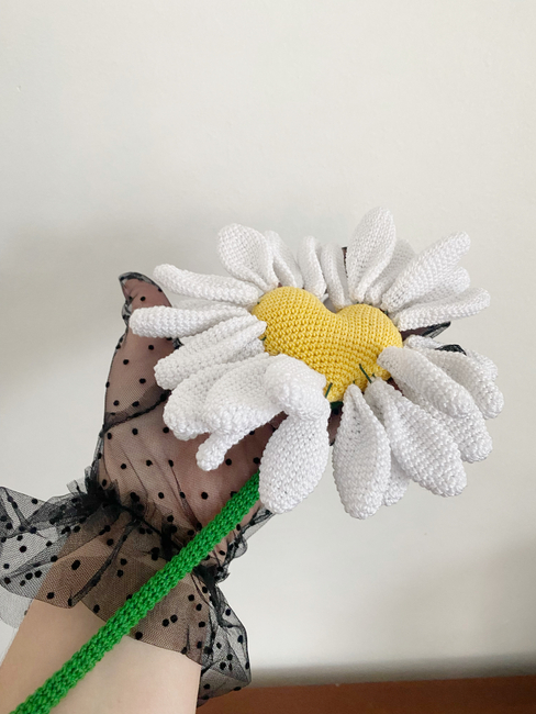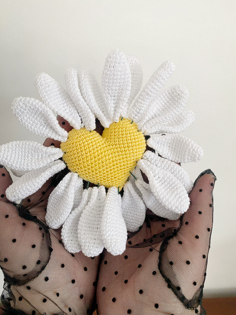 This pattern is special because the crocheted daisy has moving petals. It reminds us of our teenage years, when by holding a daisy in our hands we would find out if the person we liked loved us. This brings back fond memories.