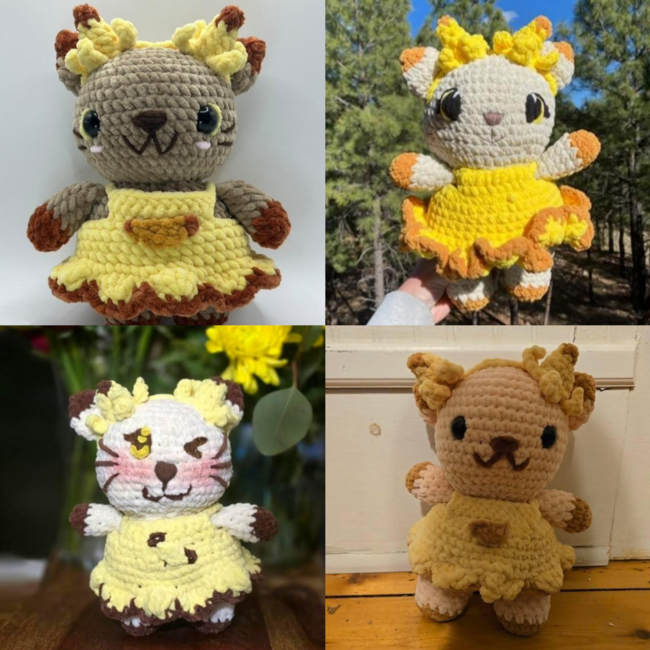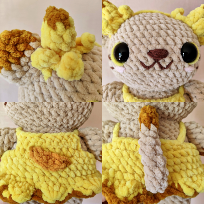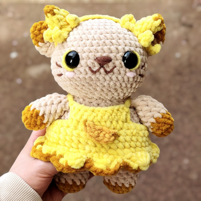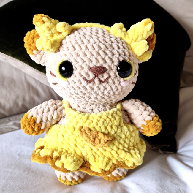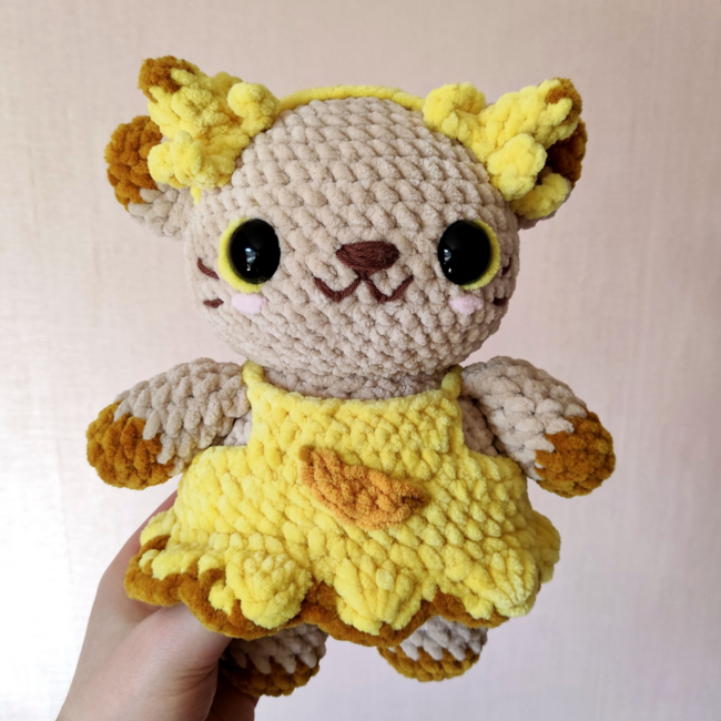 Once finished, your plush cat will be about 6-8 inches tall (depending on yarn and hook size).