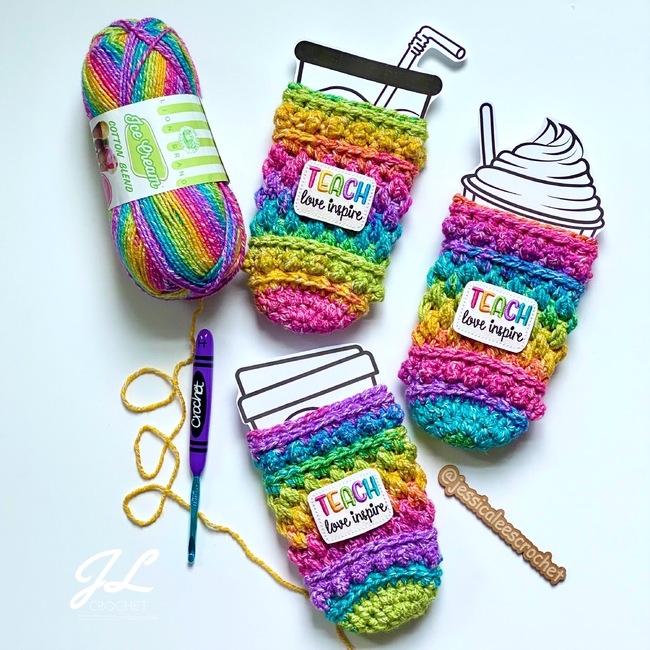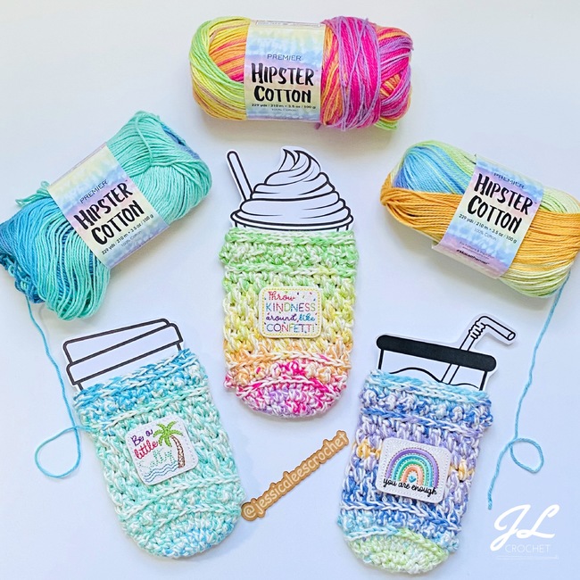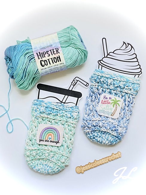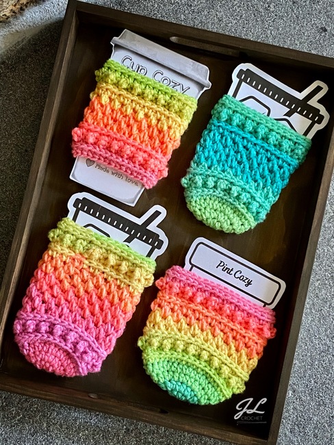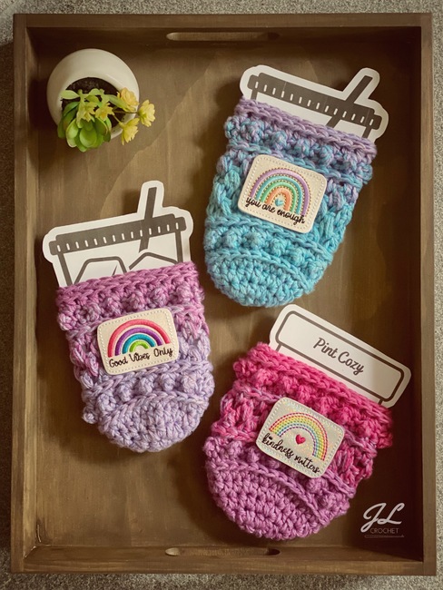 If you are looking for a unique pattern with lovely detail and texture, the Darcy Cozy Collection Pattern is a great addition to your WIPs. They work up quickly and will be great sellers at upcoming markets. This pattern uses #4 weight yarn and includes modifications for 2 strands of #3 weight yarn held together. Individual instructions included for: 16 oz and 24 oz iced beverage cozies, hot beverage cozy, and ice cream pint cozy.