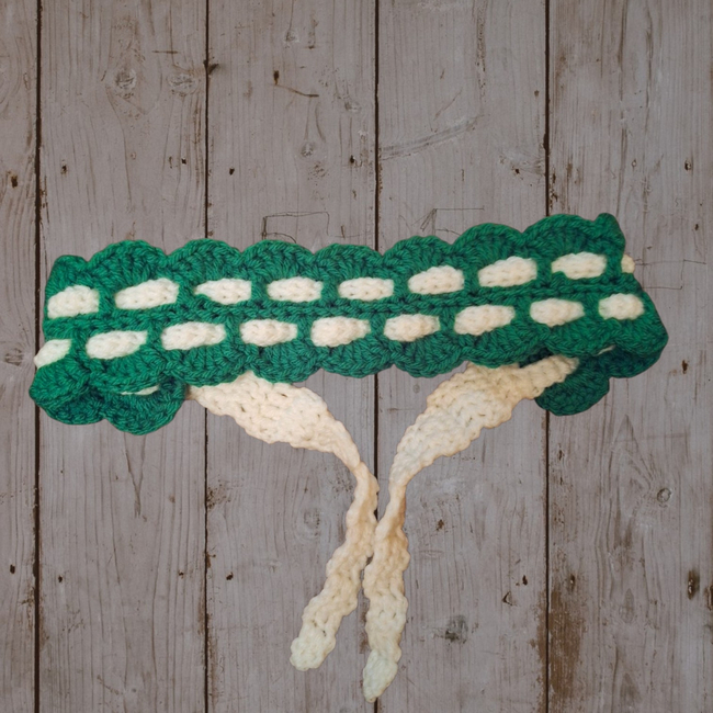To make Delilah Headband you will need: Band color, Ties color. Tools required: 4mm, Scissors, Yarn needle.