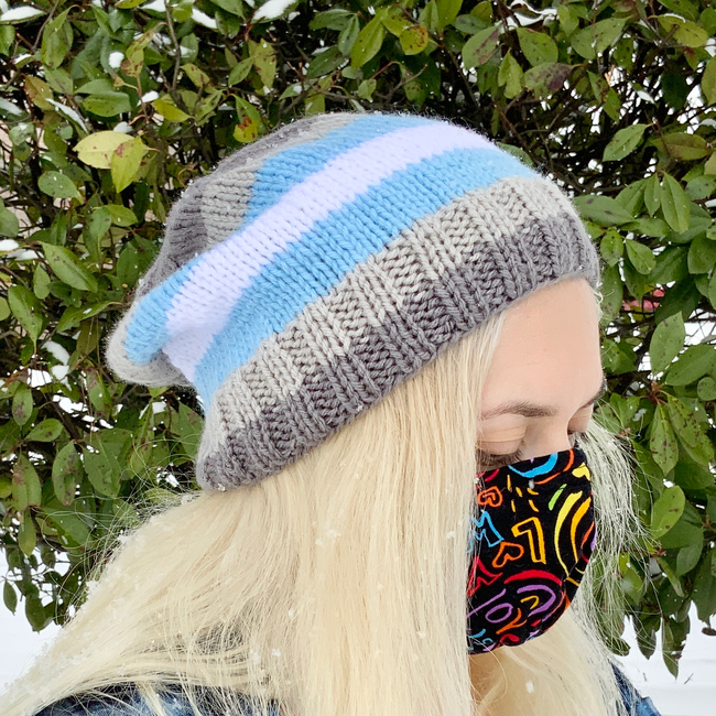 Show your pride with this simple yet stylish slouchy beanie! Worked flat with stockinette stitch and ribbing, it is a great pattern for beginners looking to branch out with some new techniques.