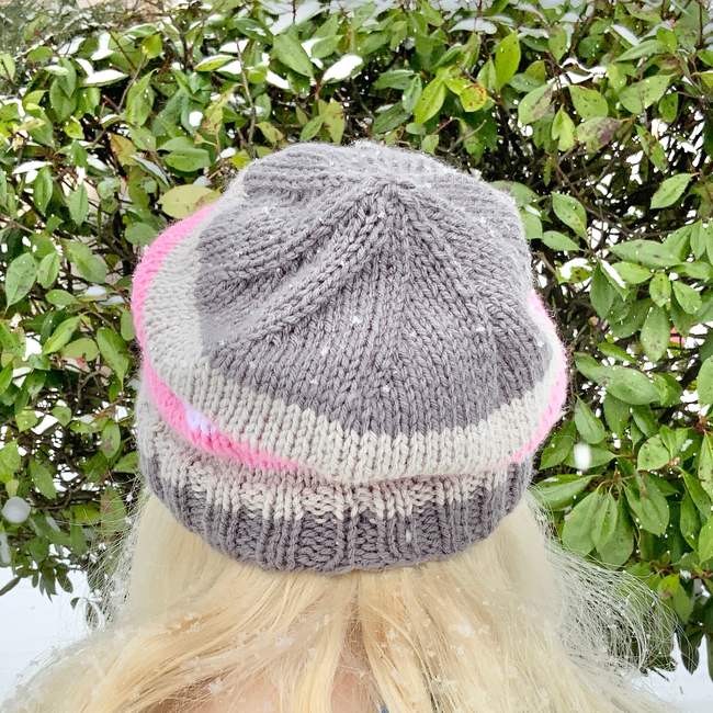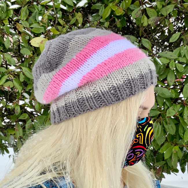 Show your pride with this simple yet stylish slouchy beanie! Worked flat with stockinette stitch and ribbing, it is a great pattern for beginners looking to branch out with some new techniques.