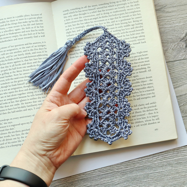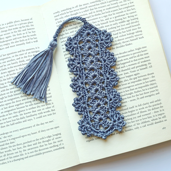 The open lace pattern creates a delicate, airy texture while the soft tassel adds a gentle movement that peeks out from the top of your book. Worked in structured denim blue cord, the bookmark keeps its shape while still feeling light and refined.