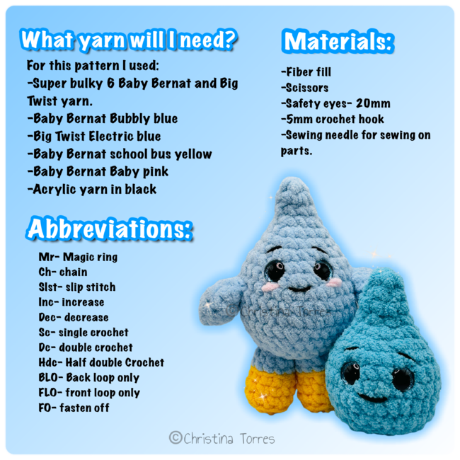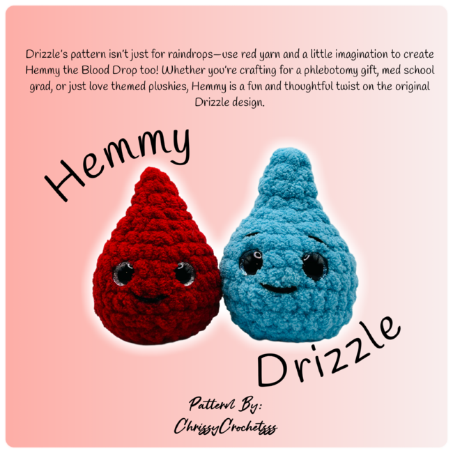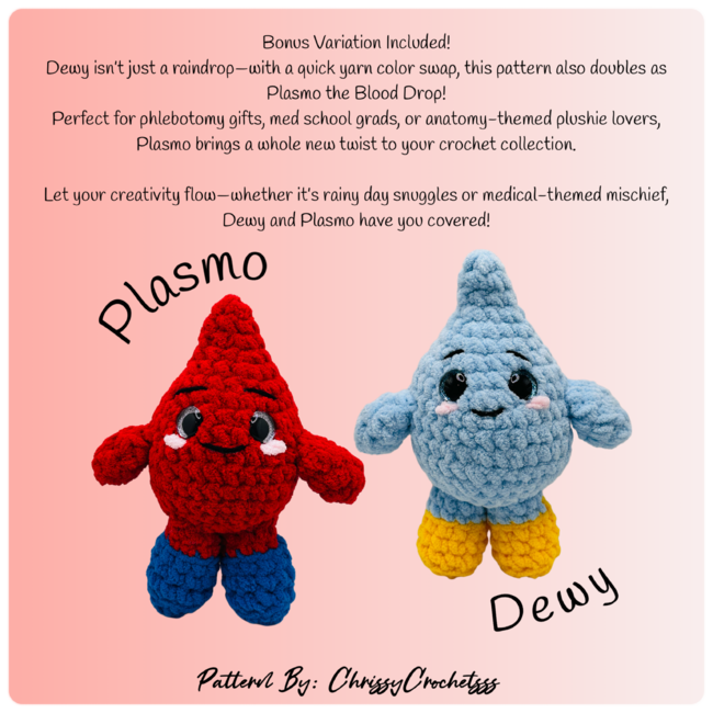 Make a splash with Dewy and Drizzle, the perfect rainy day companions! Dewy is a big, cuddly raindrop with sunny boots and a soft personality, while Drizzle brings the mini mischief and smiles. PLUS, as a special bonus, you'll also get instructions to create Plasmo and Hemmy two adorable blood drop pals ready to brighten any forecast or first-aid kit!