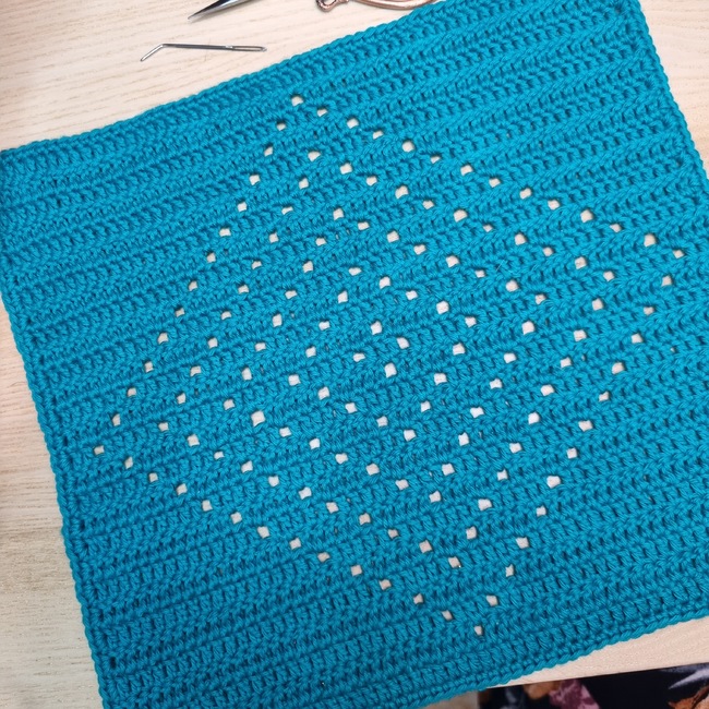 This pattern is made easy to make by having 3 different ways to help you through it. It has a simple chart with colours of where the holes are supposed to be, there is a chart with stitch descriptions, so you can visually can see where the stitches are supposed to be, and there is a written description you can follow if you are in need of any further explaination.