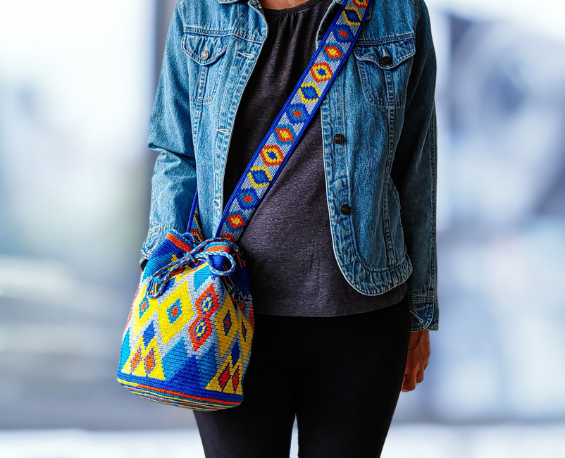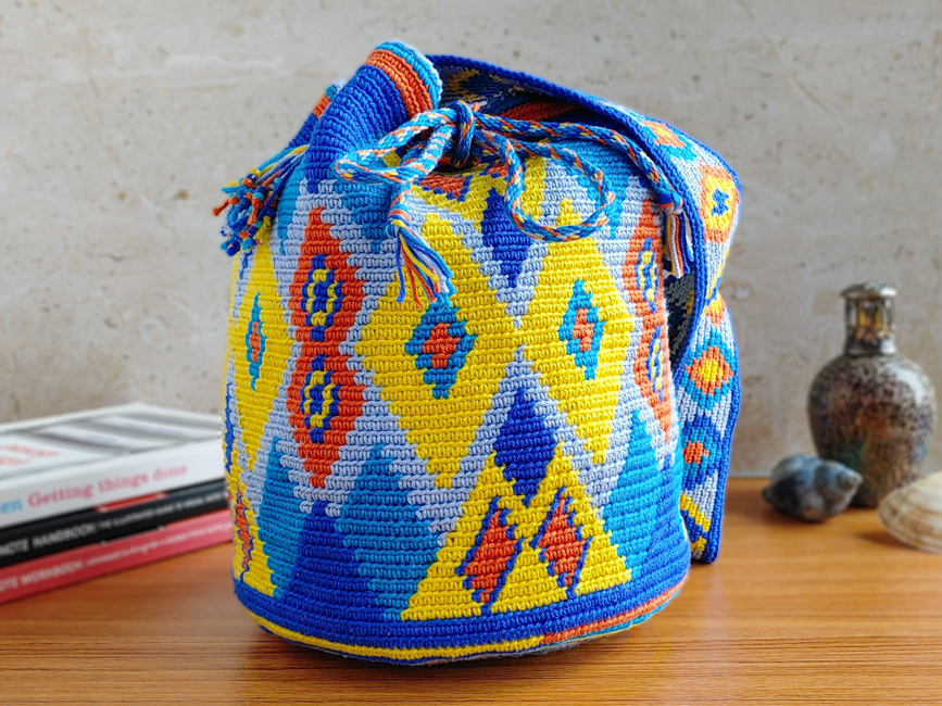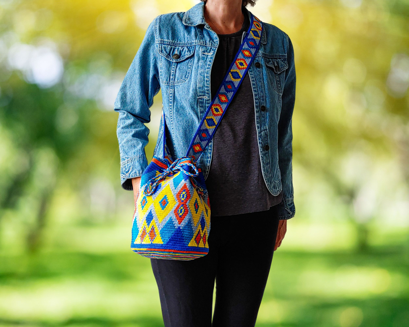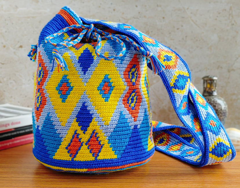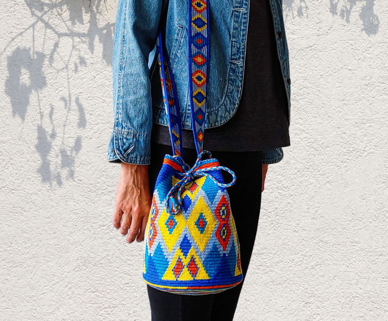 This Wayuu-inspired Diamonds Bag is an ideal companion for everyday adventures. Its eye-catching geometric pattern makes it a vibrant and stylish accessory, adding a touch of bohemian flair to your look, but it's also extremely practical. The bucket shape provides ample space for your essentials, with a drawstring closure to keep everything secure. The medium size means it's perfect for both running errands and exploring new places. And with a crocheted strap, you can wear it either crossbody or on your shoulder.