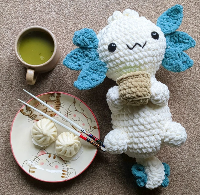 Metzlimoo Makes designed the Dim Sum Snaxolotl pattern. Find more of their patterns on their Ribblr shop page.