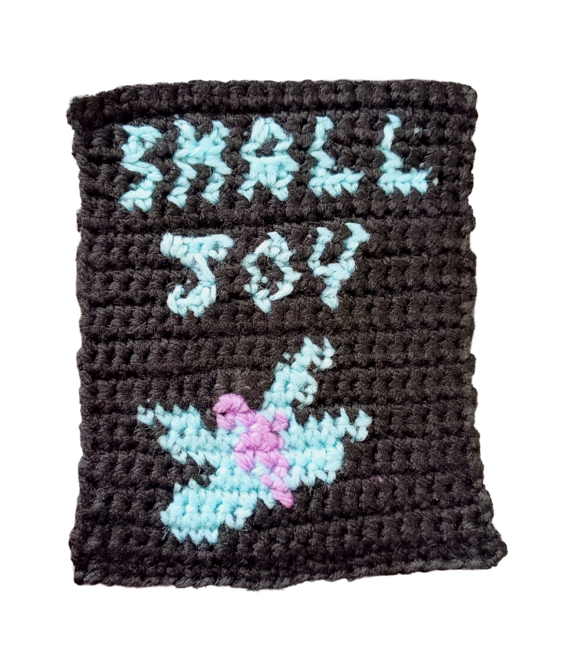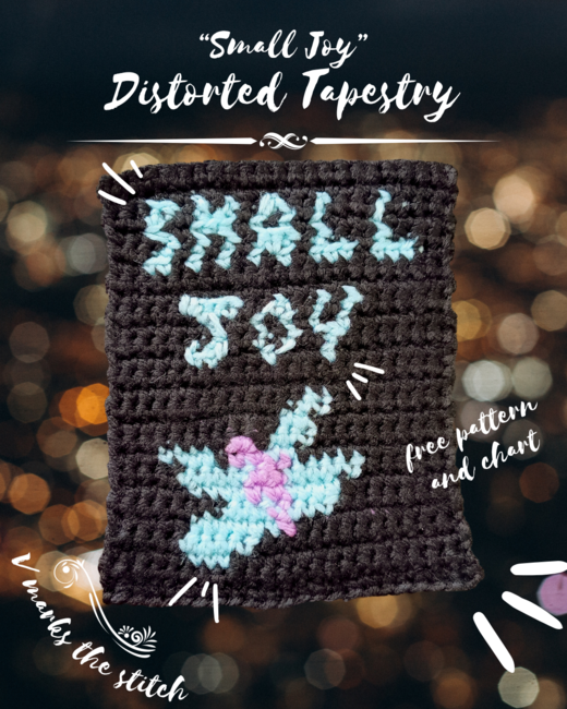 Distorted "Small Joy" Tapestry (chart included) is an Intermediate Crochet pattern designed by V marks the stitch for making a Home Decor. A quick and simple little tapestry with both written pattern and tapestry chart.The tapestry shows "Small Joy" in distorted, glitchy letters, and a small butterfly. This pattern requires working with 3 yarns for a few rows so I would say it's an i...