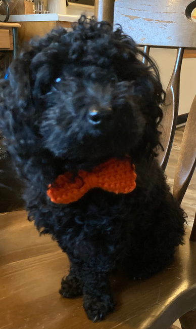 This cute little bow tie fits my baby Salem a toy poodle! Feel free to make both parts of the bow tie smaller or larger to fit your fur baby!