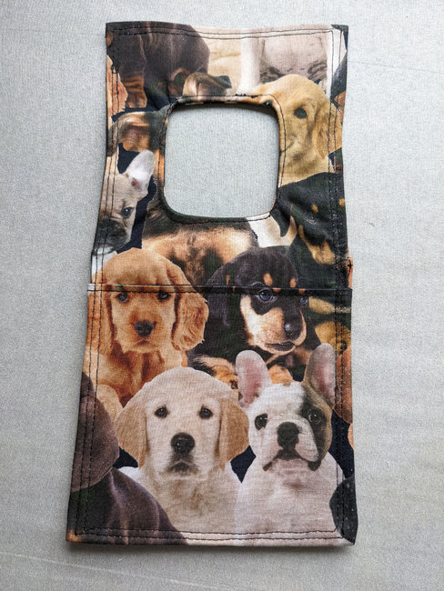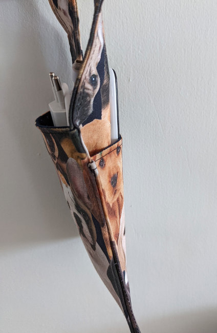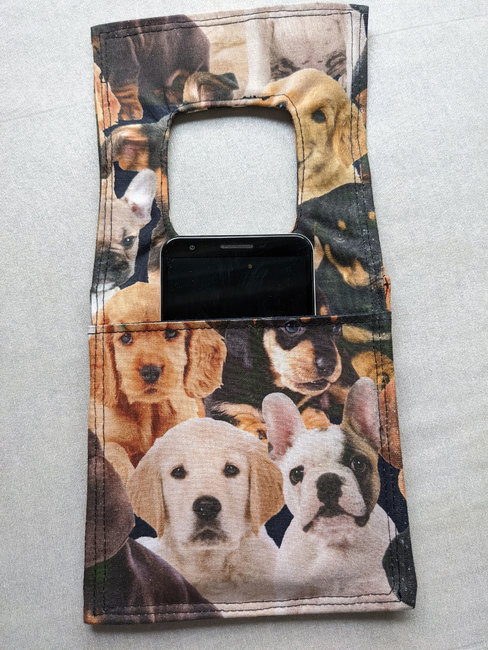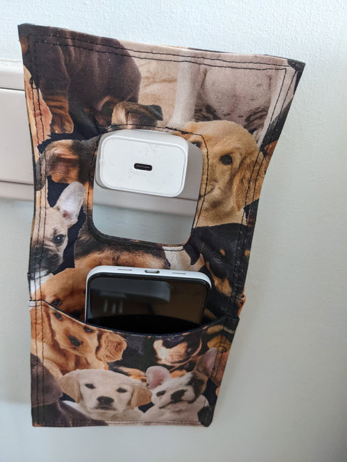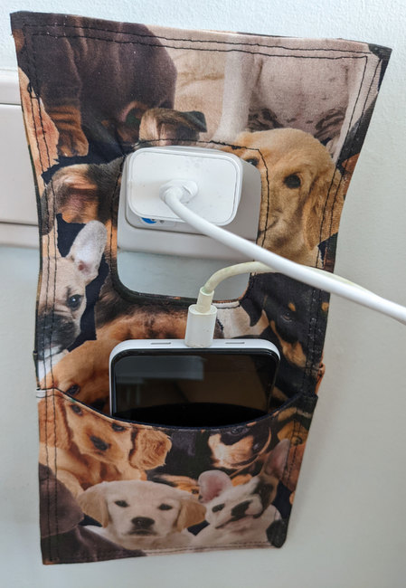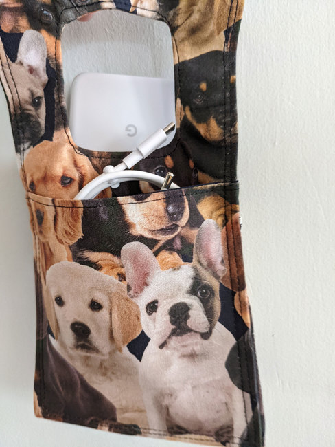 My 9-year-old nephew got a smartphone for his birthday. Since he loves dogs I decided to make him this phone hanger/charging unit using fabric with a bold print of dogs photographs.