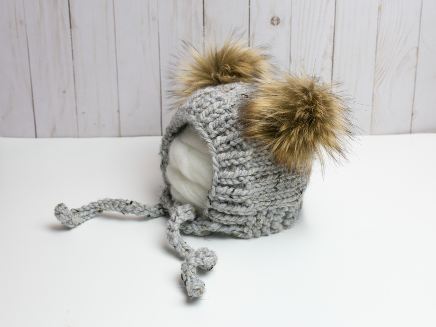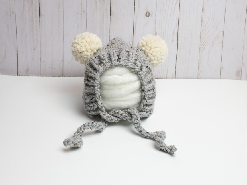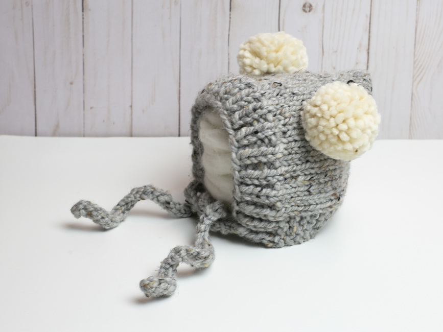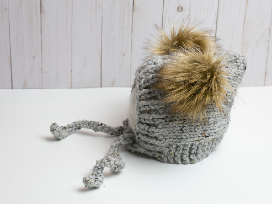 This bonnet is knit and the side ties are crocheted. If you are not familiar with crocheting, the two stitches used are very easy to learn. If you do not want to crochet the ties, an alternate option is included in the pattern.