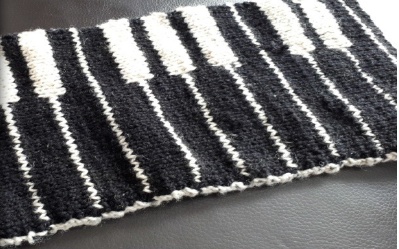 When I was looking for a double knit pattern for a keyboard scarf I couldn’t find one that I felt comfortable with. Most of the double knitting charts I see require the knitter to knit opposite and sometimes backwards on alternate rows and I didn’t want to have to keep track of when I had to switch. When I started writing and charting, I realized there were probably lots of other knitters who felt the same way. My charts for this pattern are to be read from right to left, bottom to top, and colors indicated in the chart are always the color for the first stitch in each pair. Stitches are simply knit as they are written and there is no need to reverse colors or stitches on alternate rows. The charts also have a F/B notation to let you know if you are on the front side or back.