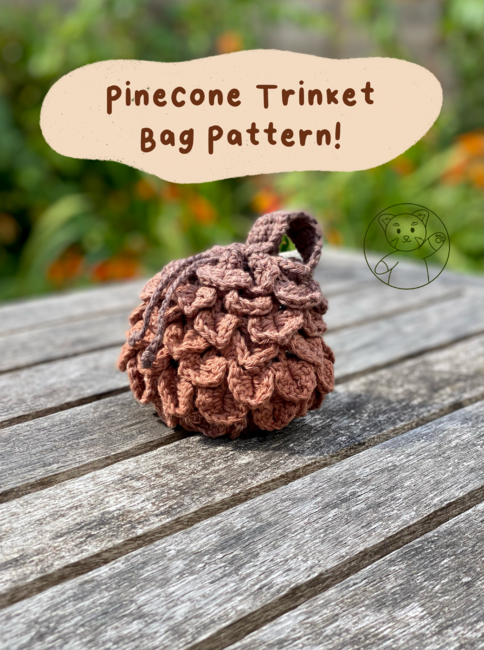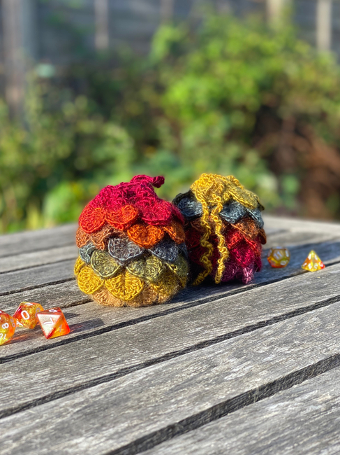 If you have never tried crocodile stitch before, I would recommend starting with the dragon egg dice bag first as there are no increases or decreases in the crocodile stitch rows: this will get you more familiar with the stitch before you make a pinecone trinket bag,