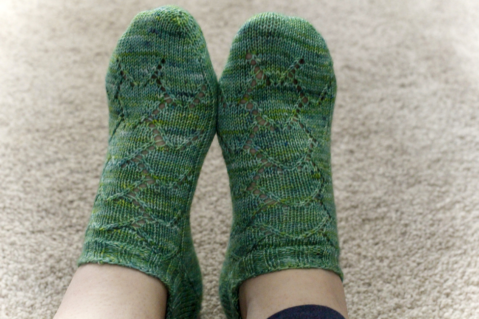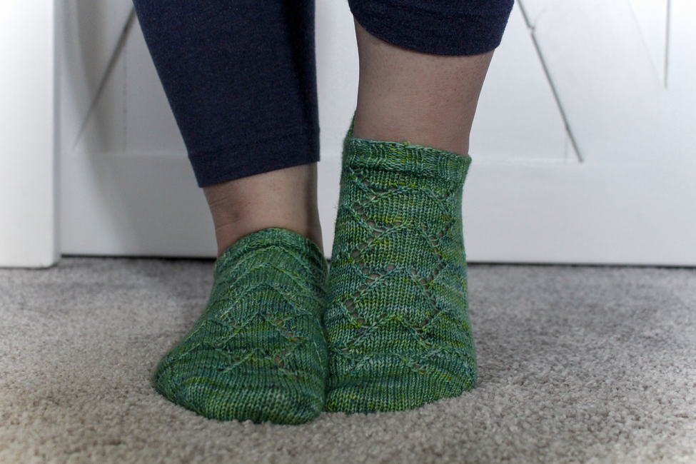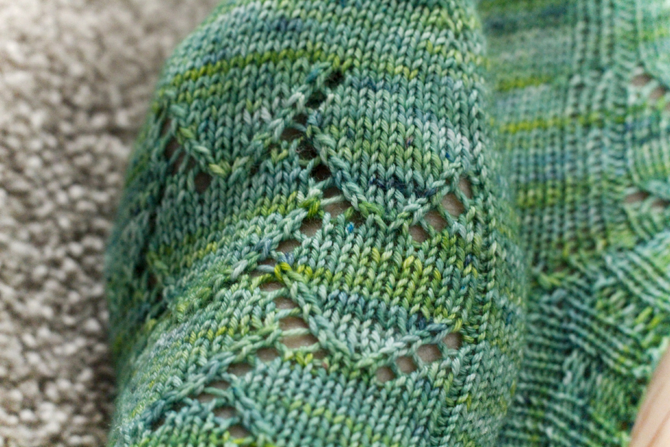 Worked in the round, Dale contains both cuff-down and toe-up written directions and a chart for the pattern stitch. The pattern has instructions for an afterthought heel, but you may substitute whatever heel you enjoy using.