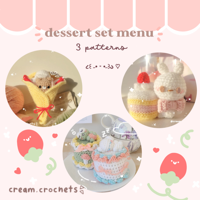 The dreamy dessert set consists of 3 of the cutest dessert patterns for the lowest price!! The patterns are super easy to follow and easily customizable, so feel free to use it to your utmost advantage and make your very own set of adorable treats ^^