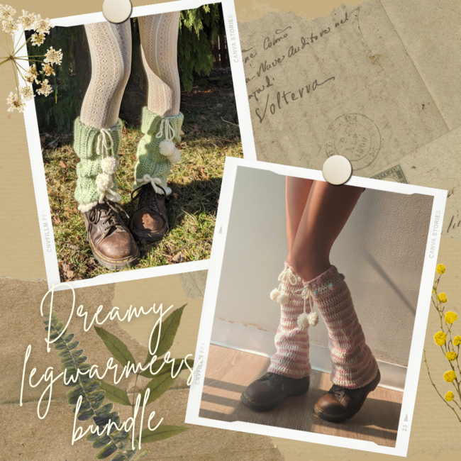 The Dreamy legwarmers pattern bundle contains the Forest Dairy legwarmers and Strawberry milk legwarmers pattern for 15% off of the individual price. You will receive a copy of the Forest Dairy legwarmers and Strawberry milk legwarmers pattern as well as the lookbook.