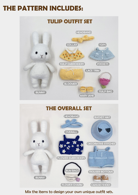*This page is for BUNNY BODY and TULIP OUTFIT SET pattern, and the OVERALL SET pattern of all 3 patterns in 1 download !