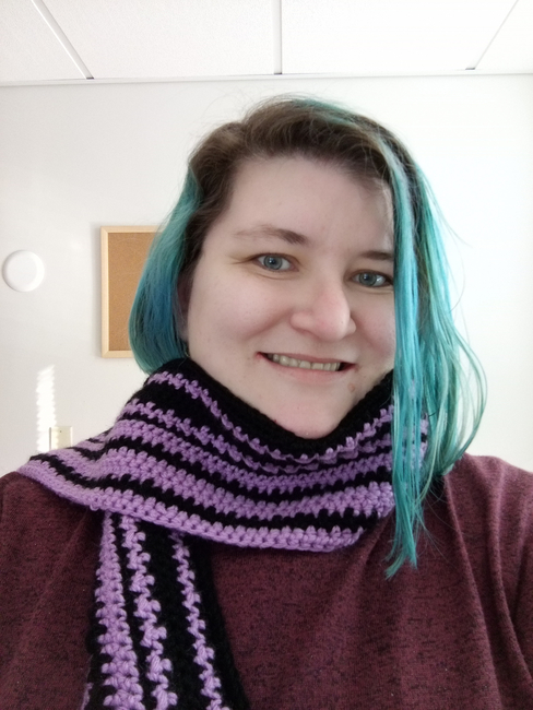 Katie's crochet corner designed the Duo striped scarf pattern. Find more of their patterns on their Ribblr shop page.