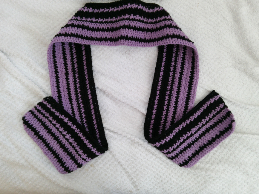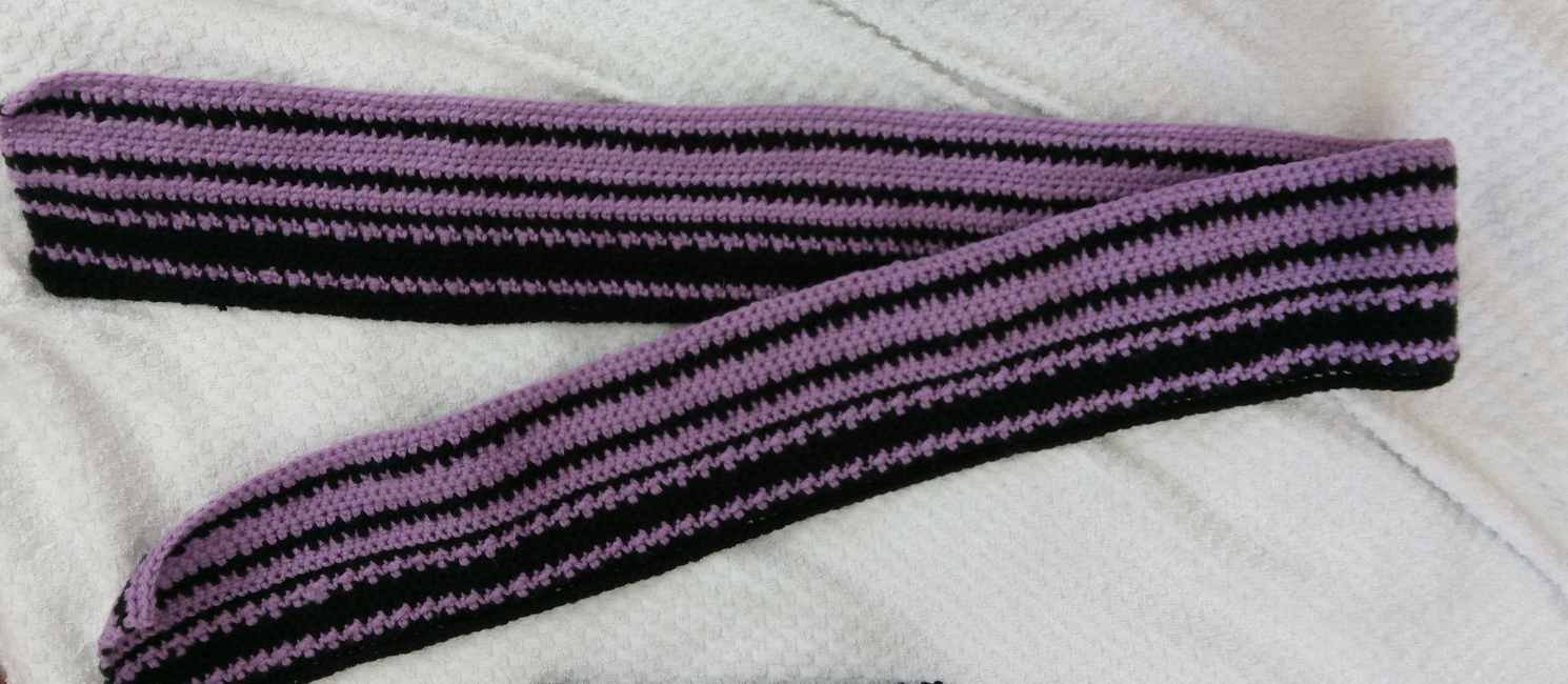 To make Duo striped scarf you will need: 1 skein black red heart super saver brand yarn. Or any color yarn you choose, 1 skein purple red heart super saver brand yarn. Or any color yarn you choose. Tools required: 4.5mm hook, Tapestry needle for weaving in ends, Scissors.